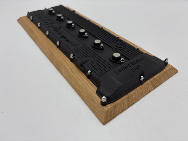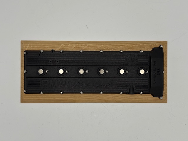 Mounted on solid oak wood, it features a scaled-down replica of the unmistakable M88 valve cover. Where the spark plug openings would normally sit, discreet magnets are integrated to securely hold your keys. The combination of warm oak and raw racing heritage creates a striking balance between design and performance history.